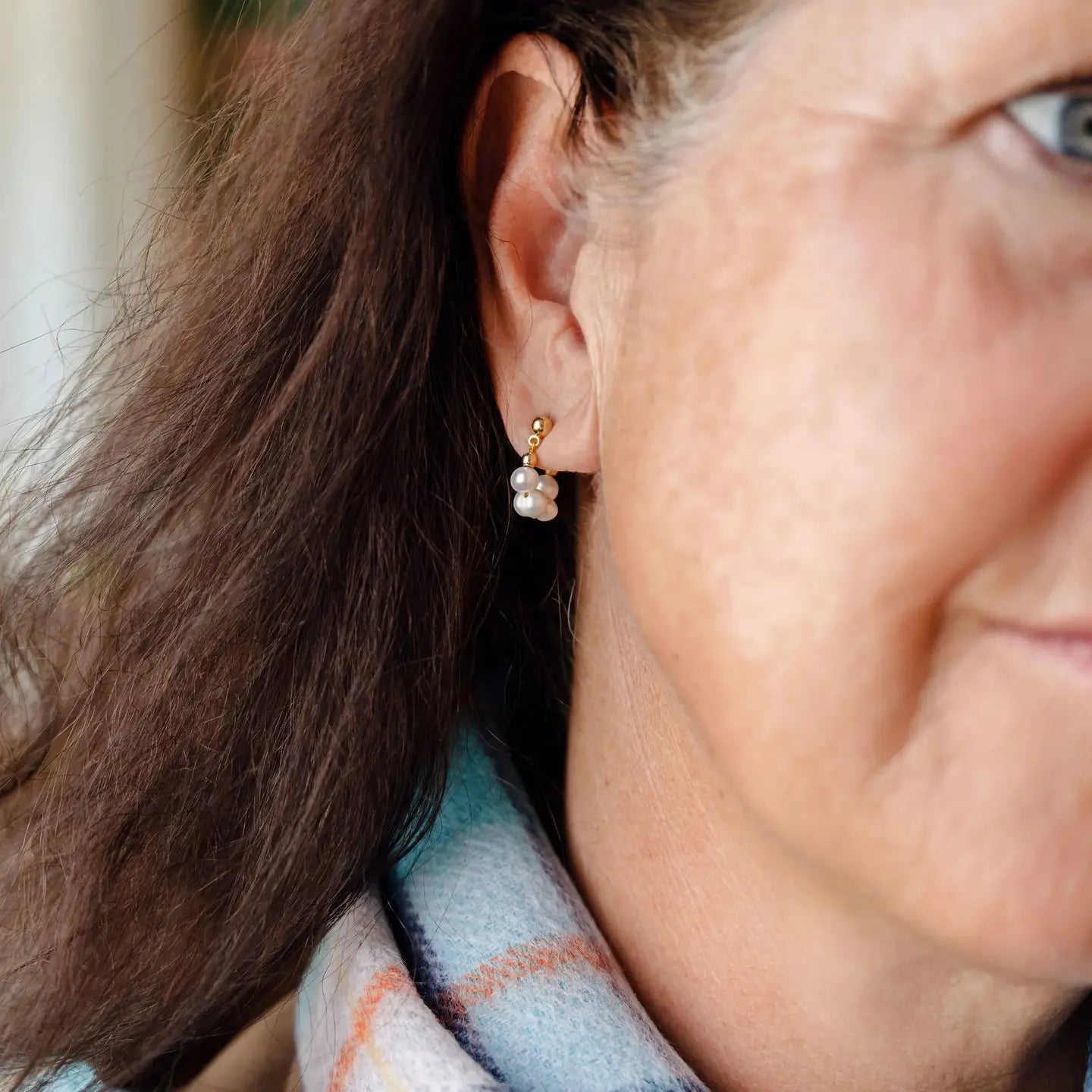 These stunning earrings are the perfect combination of classic elegance and modern style. Crafted from a gold plated material, they feature 4 freshwater pearls that make a elegant hoop shaped earring that can be worn day or night. Dimensions: 2cm All posts are surgical steel and are gold plated