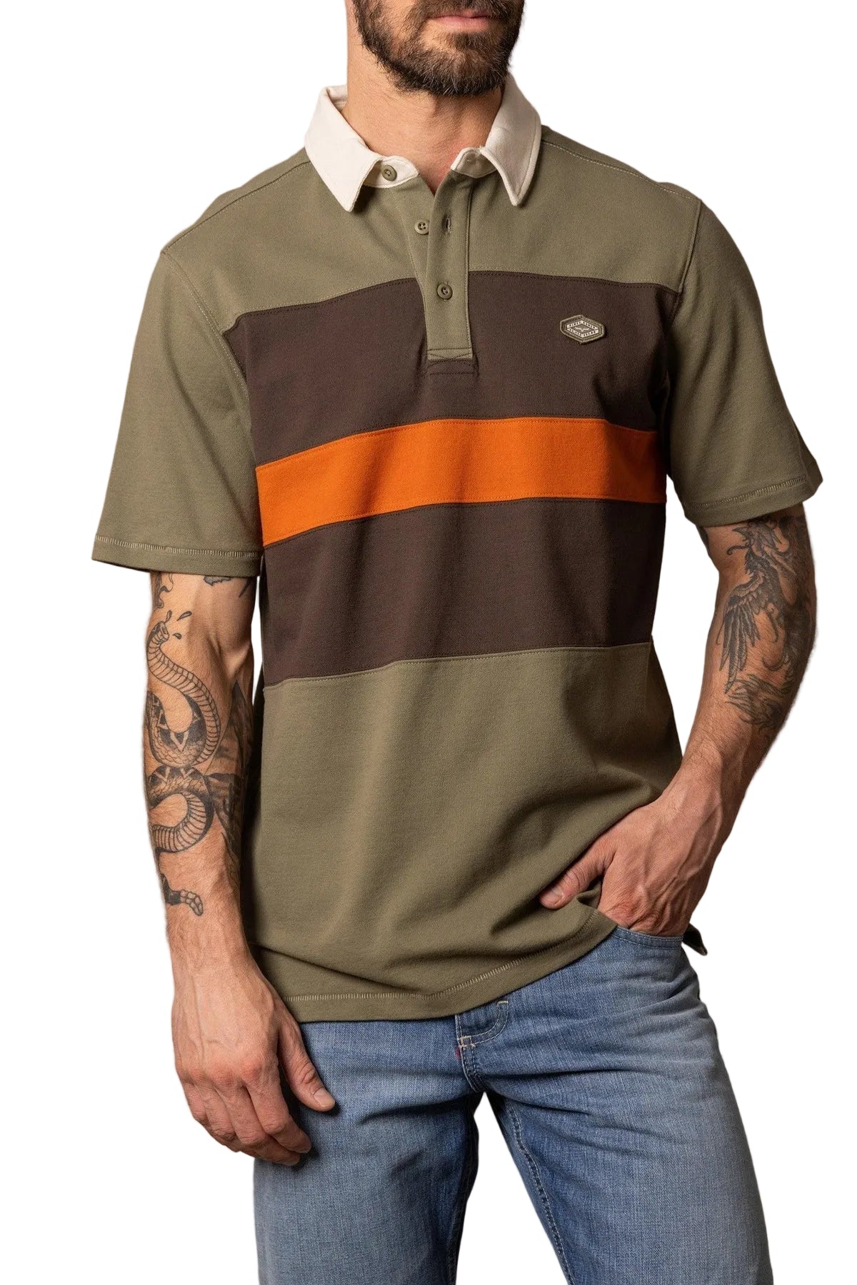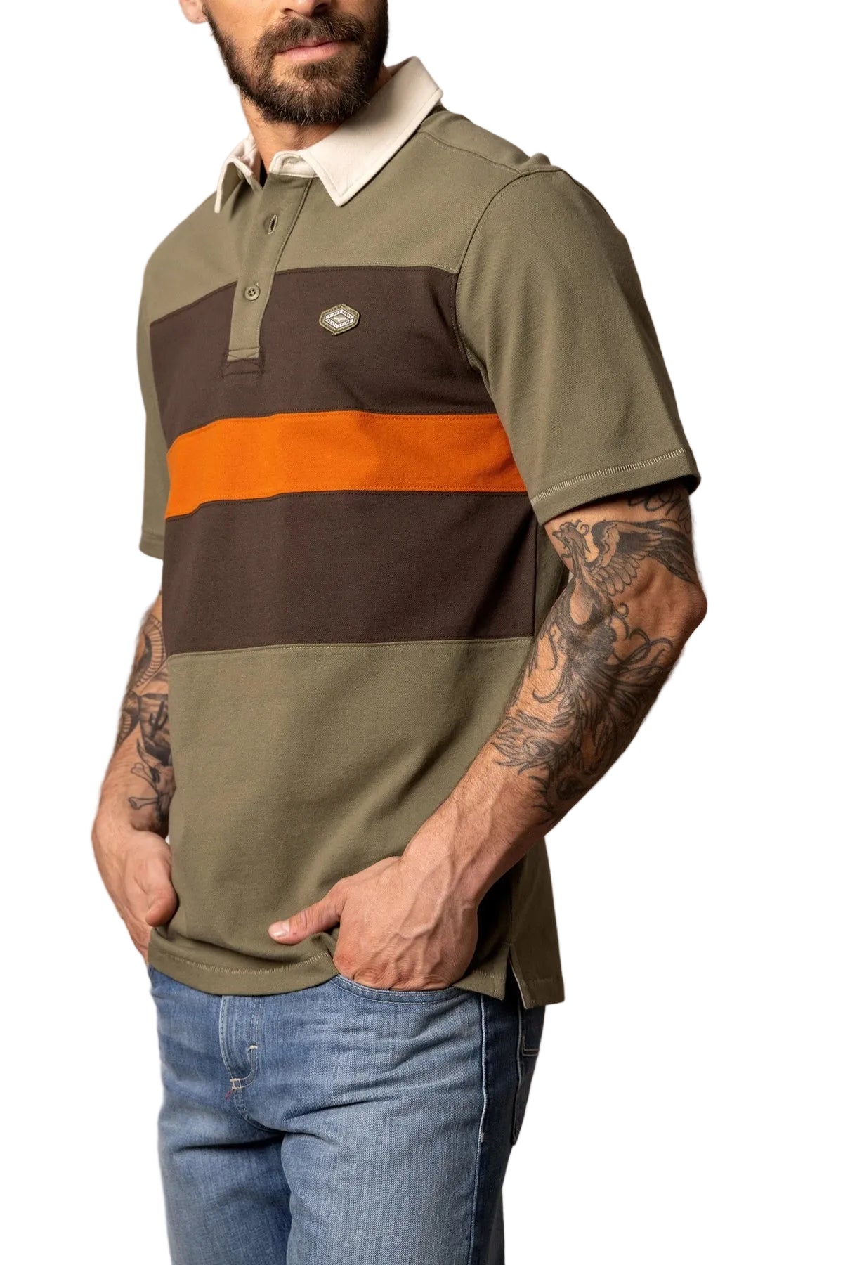 This bold piece is a modern take on classic 70s rugby style, infused with our signature western flair. The diamond Kimes Ranch logo placed on the left chest adds an authentic touch. Crafted for comfort and mobility, the button neckline and side seam slits allow for both. Featuring bold horizontal chest stripes in a rustic color palette, this polo is a statement piece that demands attention.