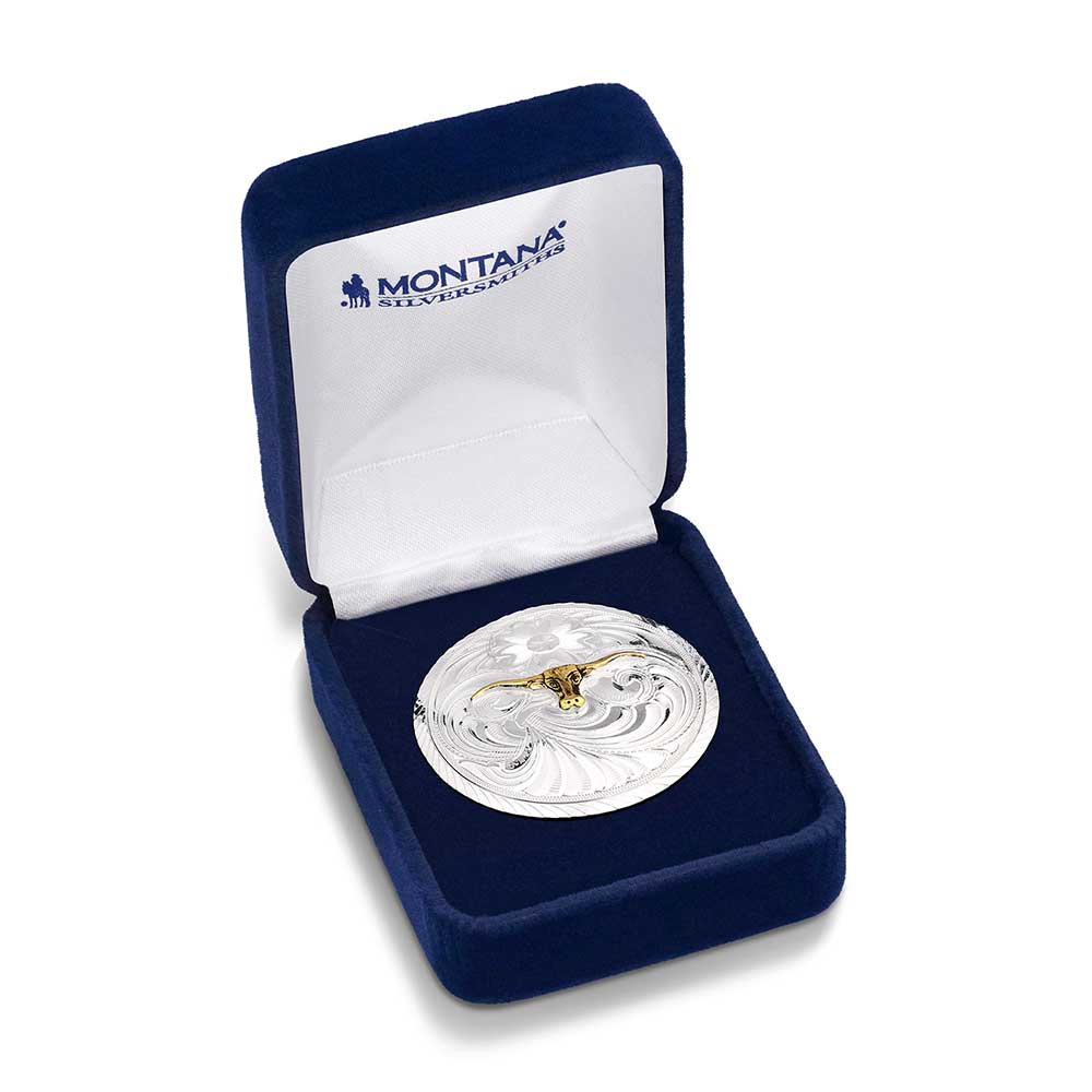 Add some shine to any scarf with the Classic Montana Scarf Slide with Longhorn. This scarf slide features an antiqued gold finished longhorn figure in the center. Classic bright cut engravings create the backdrop for the scarf slide.