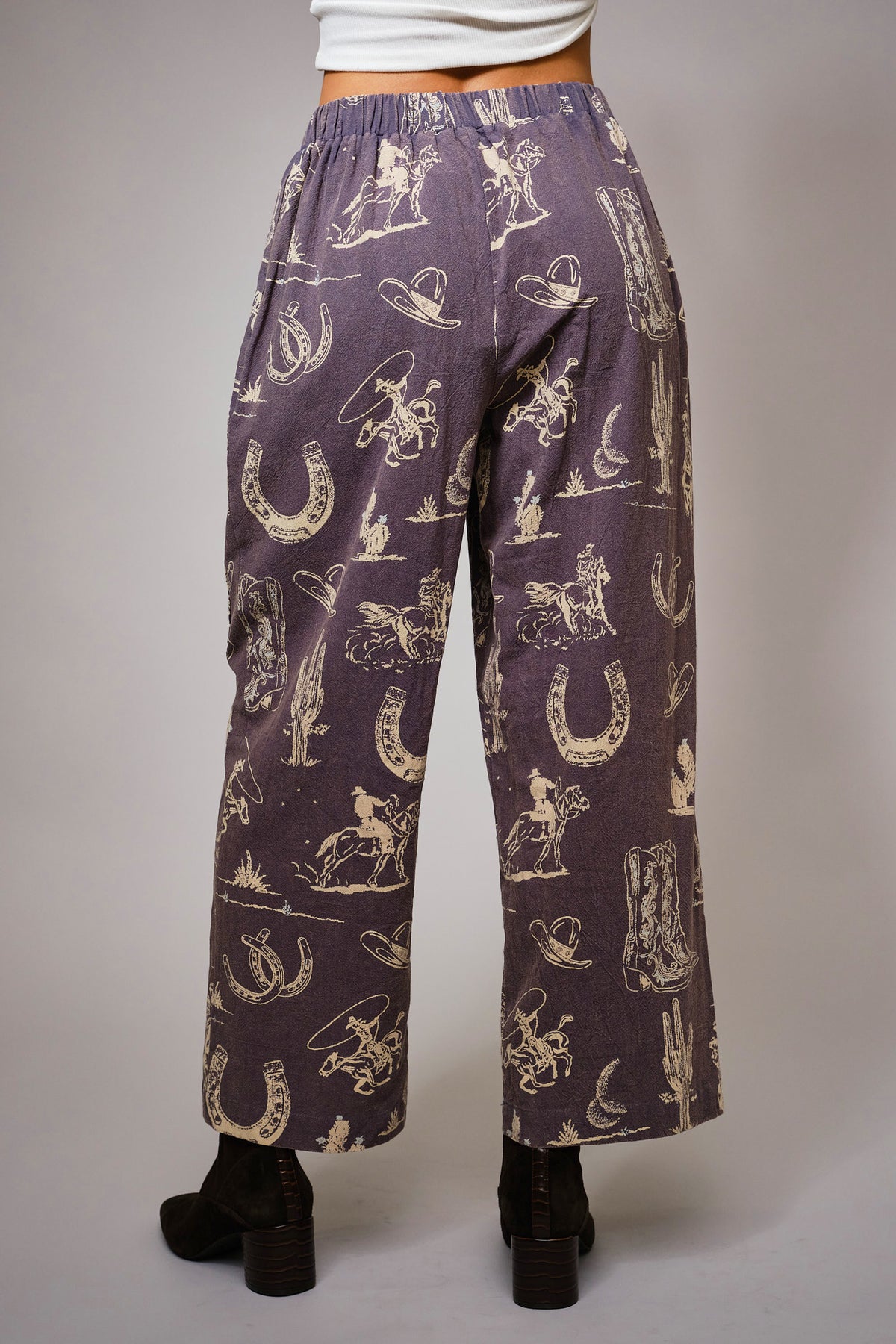 Easy-fit wide leg pants with allover vintage Western illustrations including cowboy boots, hats, cacti, and horseshoes. Features a textured creased fabric, front patch pockets, and an elastic back waistband with button tab detailing. 100% Cotton Model is 5'8" tall and wearing size Small