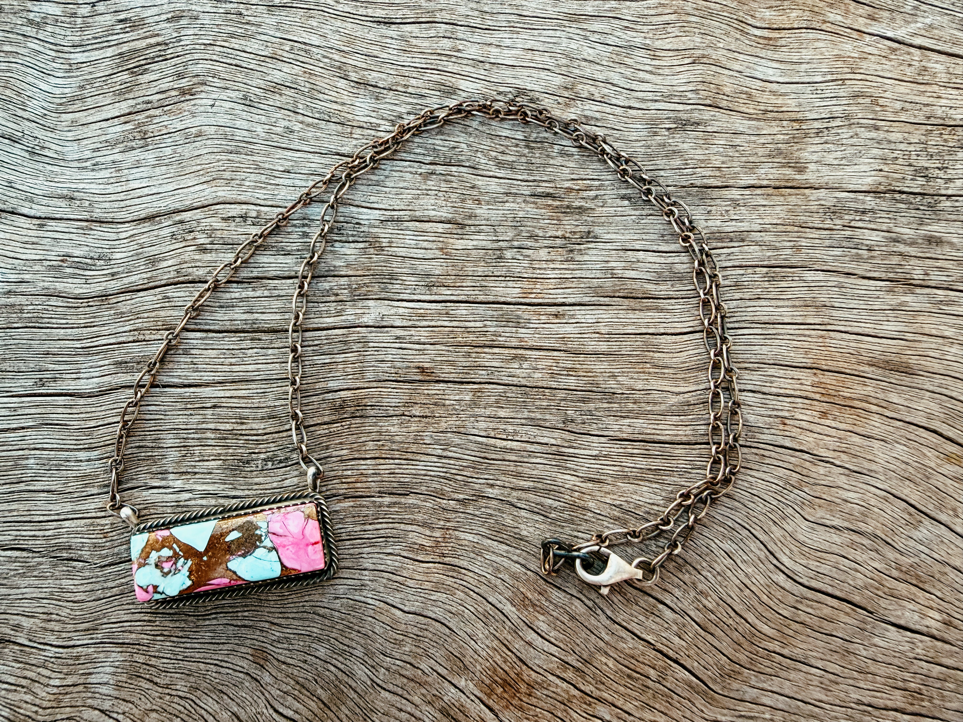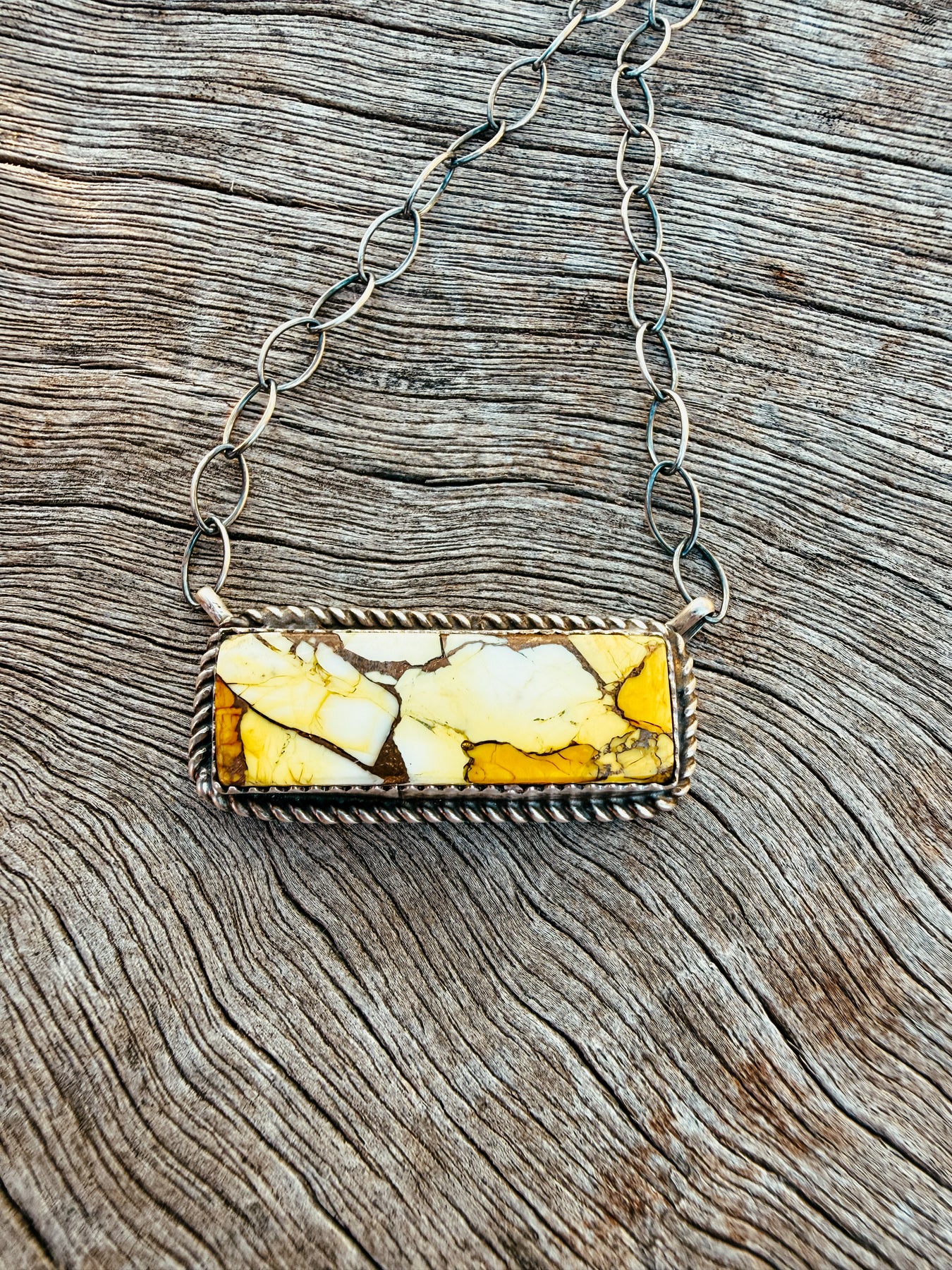 Handcrafted by Native American artisans from Arizona, the Buffalo Belle bar necklace features a warm honey dahlia stone set in authentic sterling silver. This one-of-a-kind piece showcases traditional southwestern craftsmanship with natural stone variations that add genuine character to any western look.