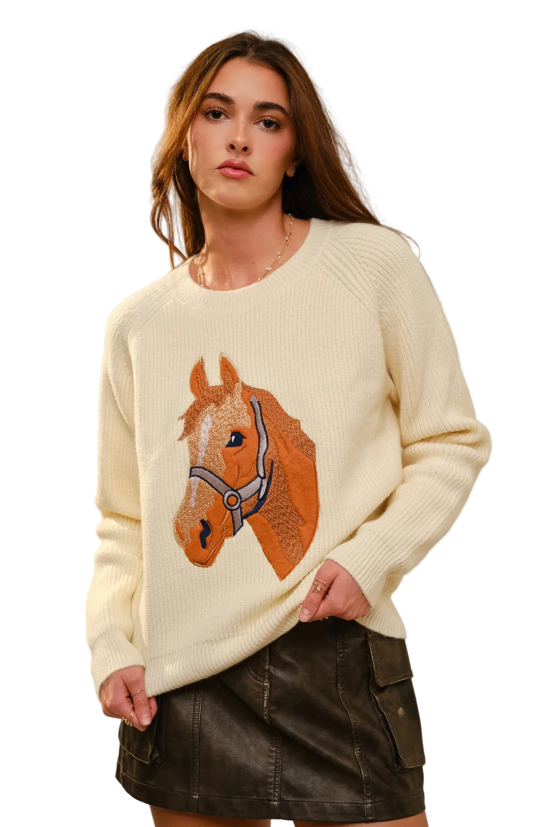 Buffalo Belle - Womens Cream Horse Embroidery Knit  Sweater