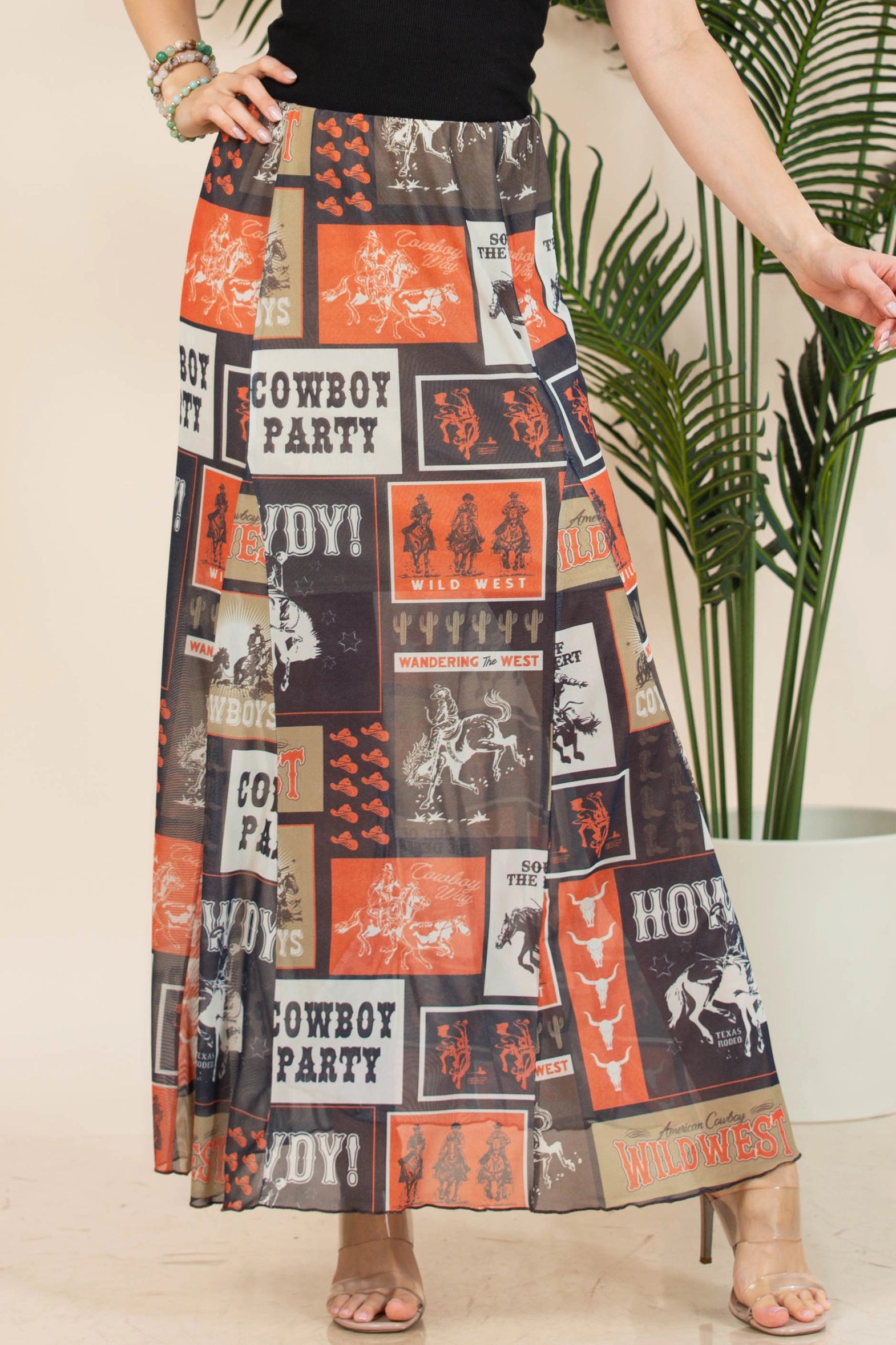 Aztec print relaxed fit elastic waistband lined full length mesh skirt