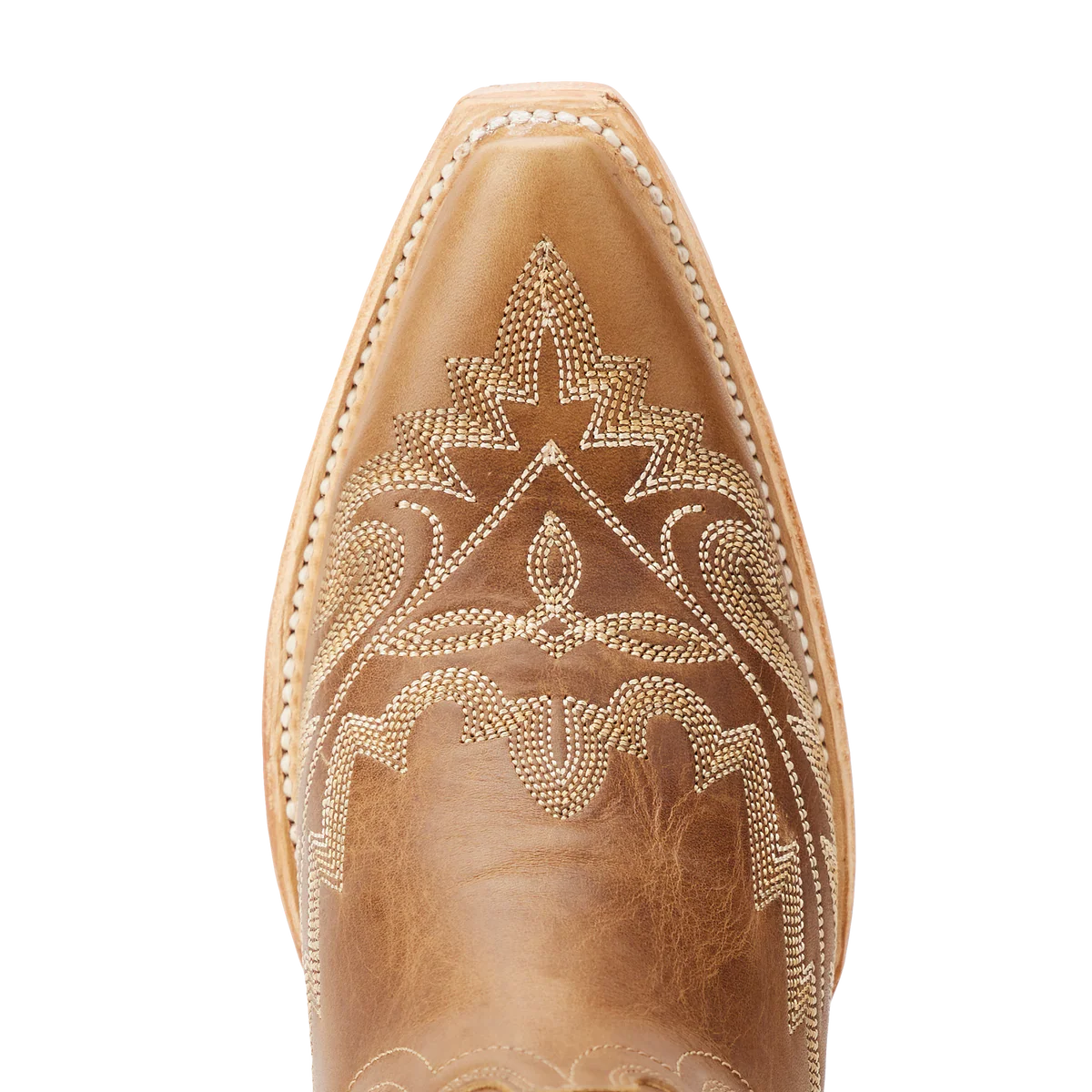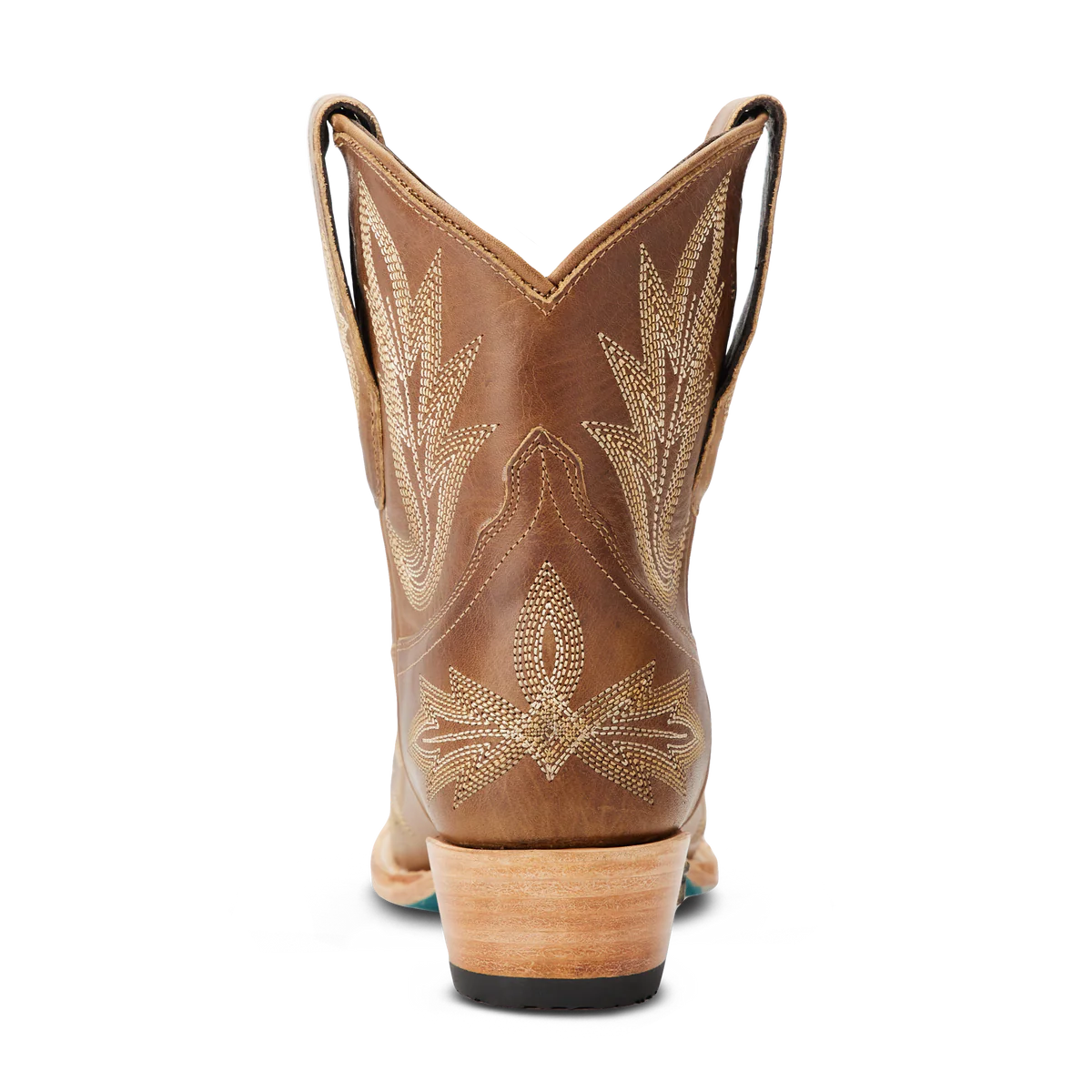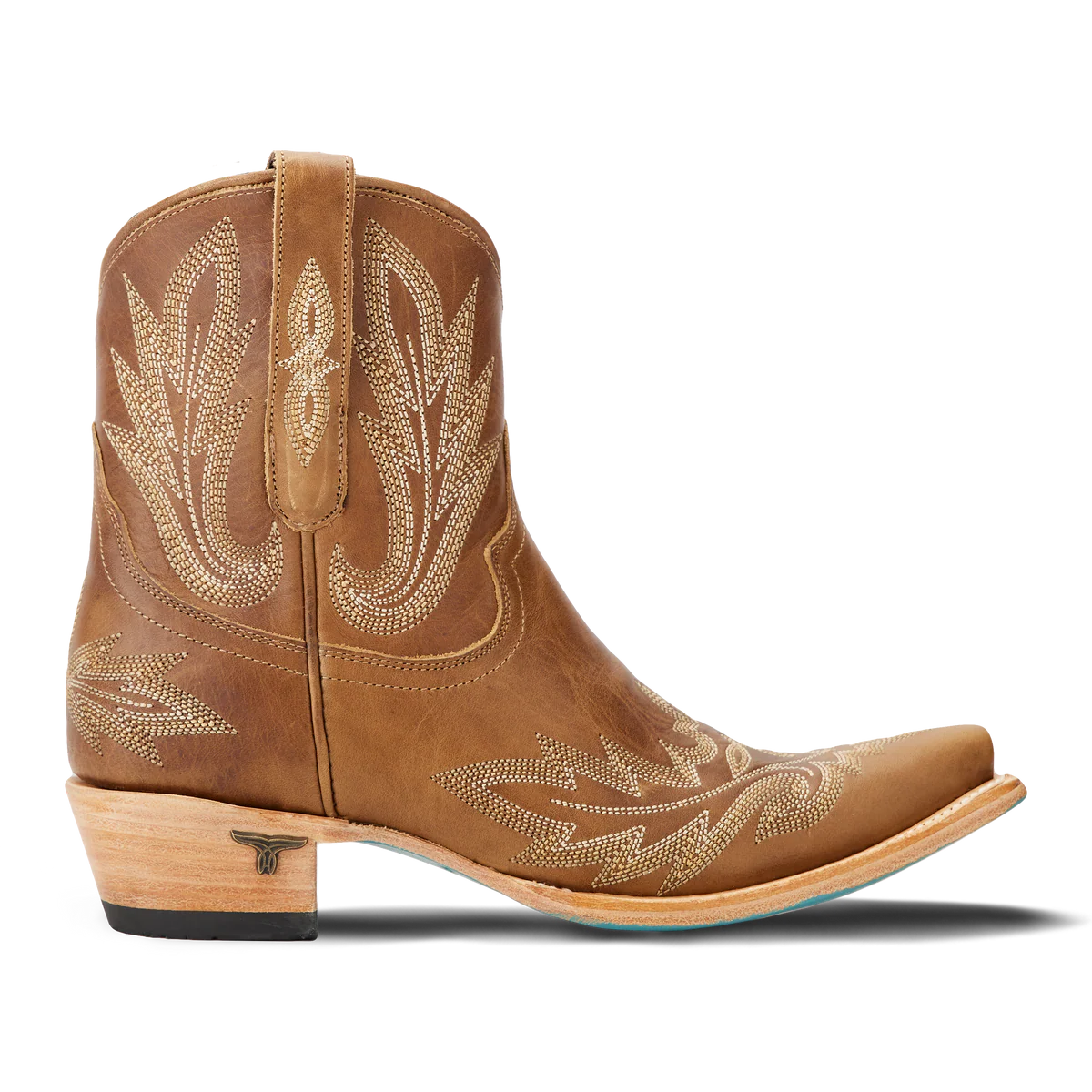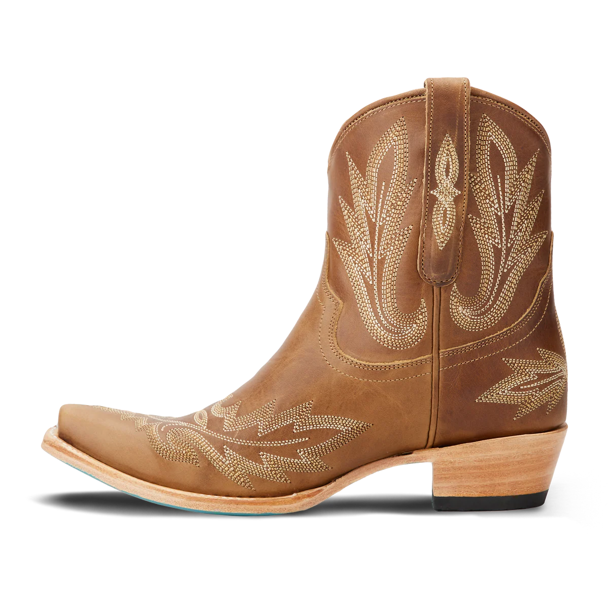 Heirloom quality ankle boots with a western influence. The classic snip toe profile is embroidered to perfection with a twist on traditional flame stitch in bootie form. She's short, sweet, and just the right height to pair well with your wardrobe.